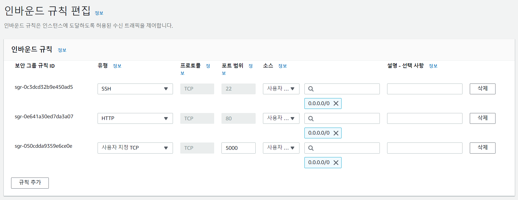 인바운드 규칙 추가는 우리가 사용할 인스턴스의 포트번호를 추가해준다.