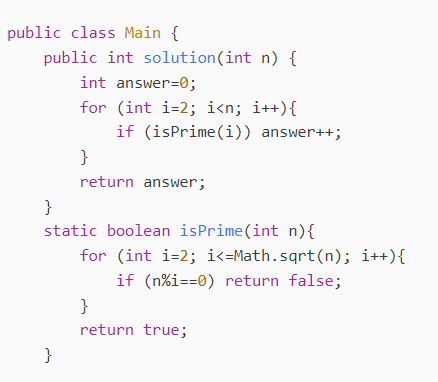 isPrime으로 각 소수를 찾는다( i=2일때부터 root n까지 탐색)하고 n%i == 0이면 false를 반환한다.