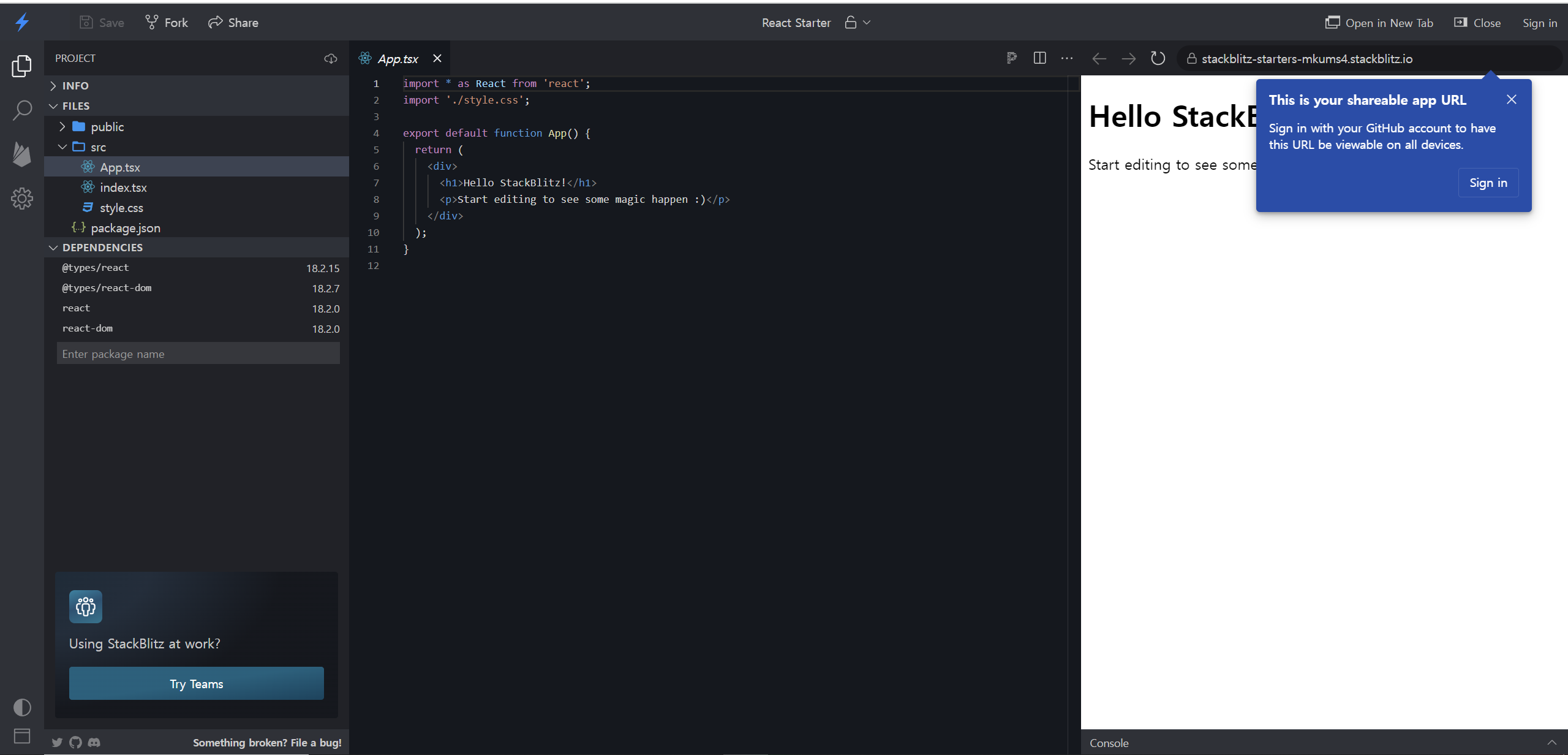stackblitz에서는 무료로 리액트를 경험해볼 수 있는 환경을 제공한다. 리액트 뿐 아니라 Node 기반의 여러 어플리케이션을 체험해볼 수 있도록 제공하니, 내 컴퓨터에 vsc가 깔려있지 않다고 좌절하고 라이트하게 사용해보자.