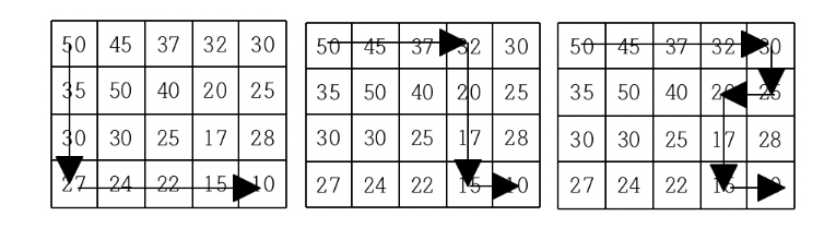 현재 제일 왼쪽 위 칸이 나타내는 지점에 있는 세준이는 제일 오른쪽 아래 칸이 나타내는 지점으로 가려고 한다. 그런데 가능한 힘을 적게 들이고 싶어 항상 높이가 더 낮은 지점으로만 이동하여 목표 지점까지 가고자 한다. 위와 같은 지도에서는 다음과 같은 세 가지 경로가 가능하다.